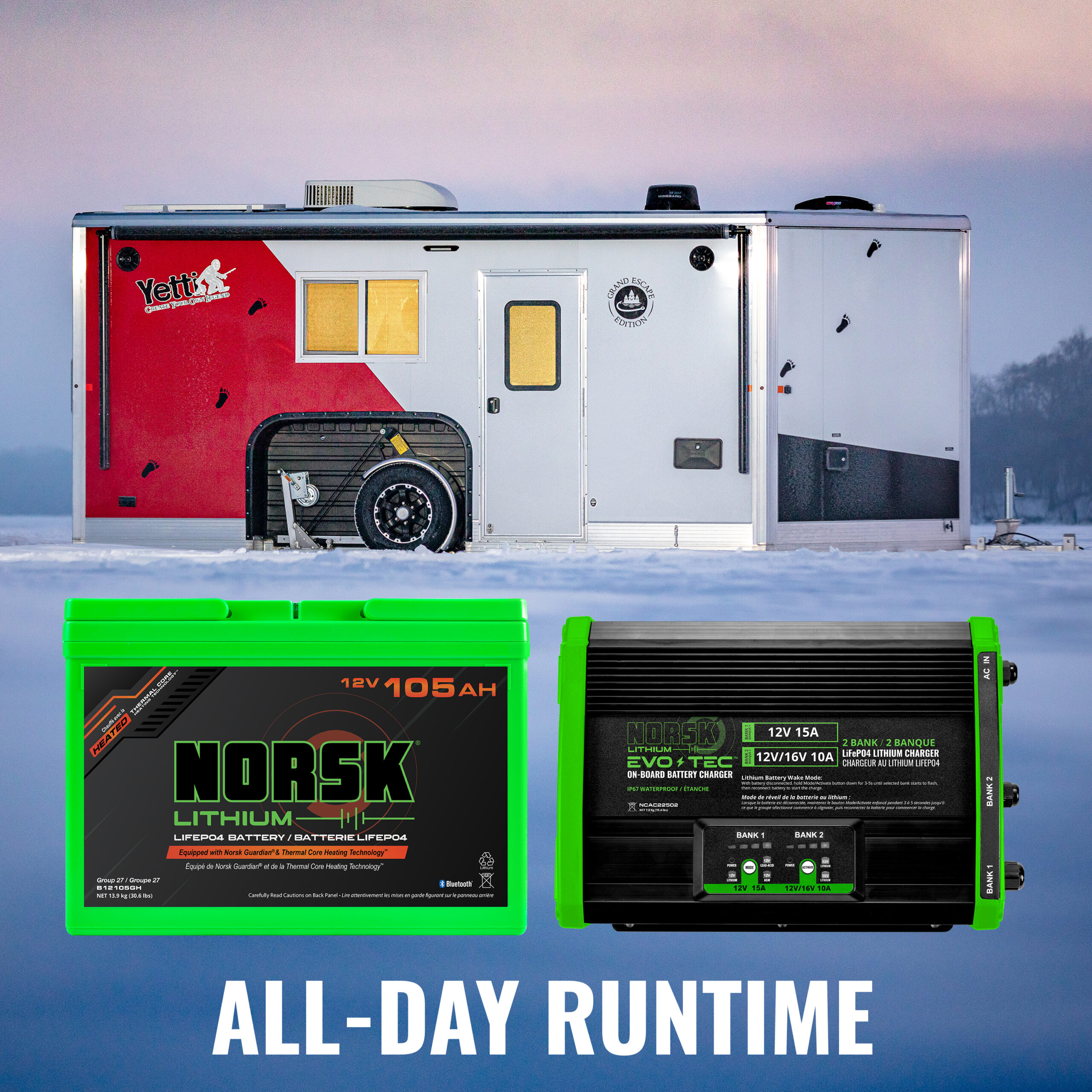At the core of the package is a Norsk Lithium 105Ah deep-cycle battery, engineered for stable, consistent 12V output to run lighting, electronics, and accessories, as well as inverter-powered 120V loads. Designed specifically for deep-cycle use, the battery maintains steady voltage under continuous load, making it ideal for smaller electrical systems, shorter trips, or supplemental power needs. Compared to traditional lead-acid batteries, lithium technology provides half the weight, twice the runtime, five times faster charging, and up to five times the lifespan, reducing long-term replacement costs and overall cost of ownership while delivering years of dependable performance.